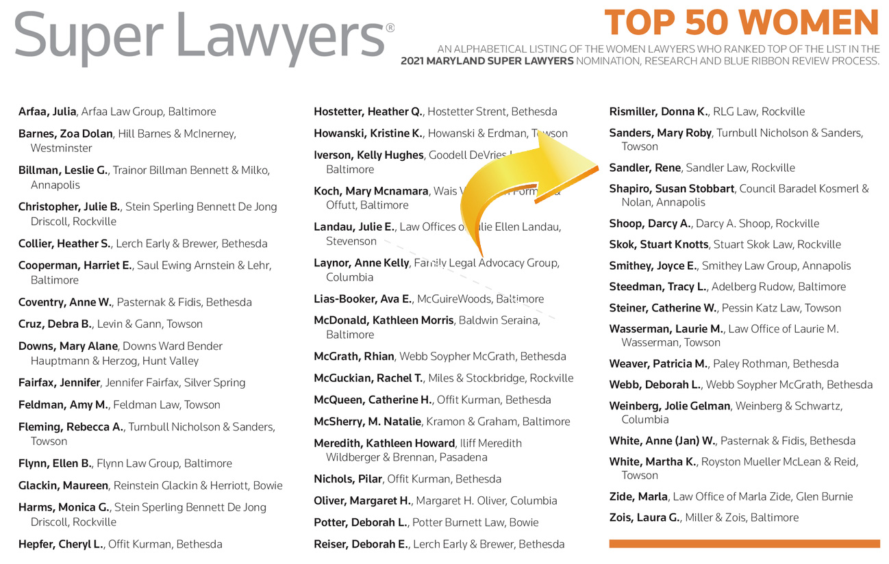 Rene Sandler named to 2024 SuperLawyers Top 50 Women Lawyers in Maryland, Top 100 Lawyers in Maryland, and is one of best criminal lawyers in the State.